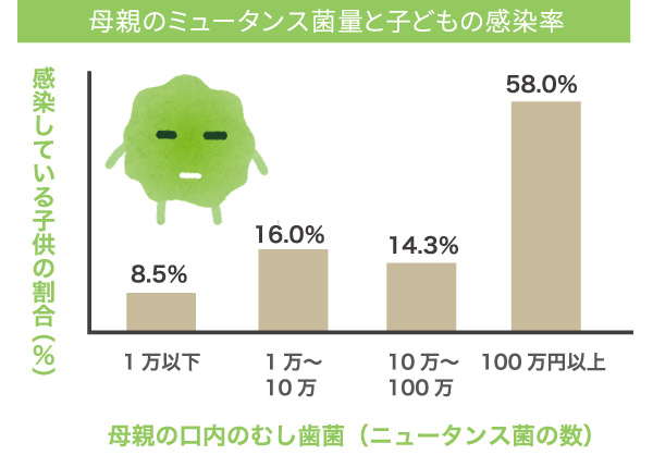 実は生まれたばかりの赤ちゃんにはむし歯の原因菌は存在しません。ではどこからむし歯菌に感染してしまうのか…?実は周囲の大人たちから感染してしまうのです。実際に、おかあさんのお口にむし歯菌が多いと、そのお子様がむし歯菌に感染する可能性が高まることが調査によりわかっています。